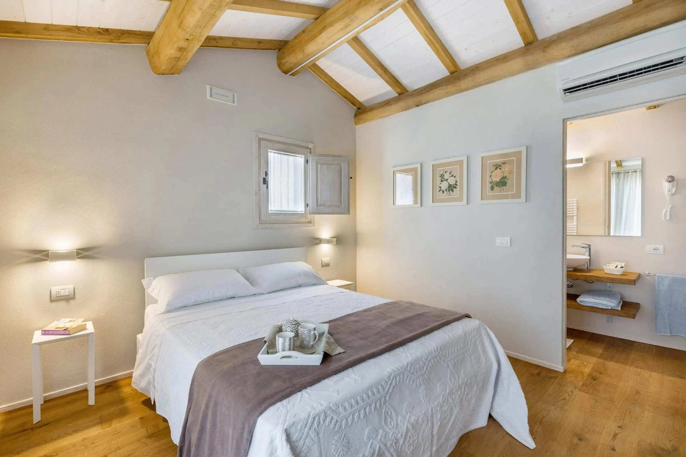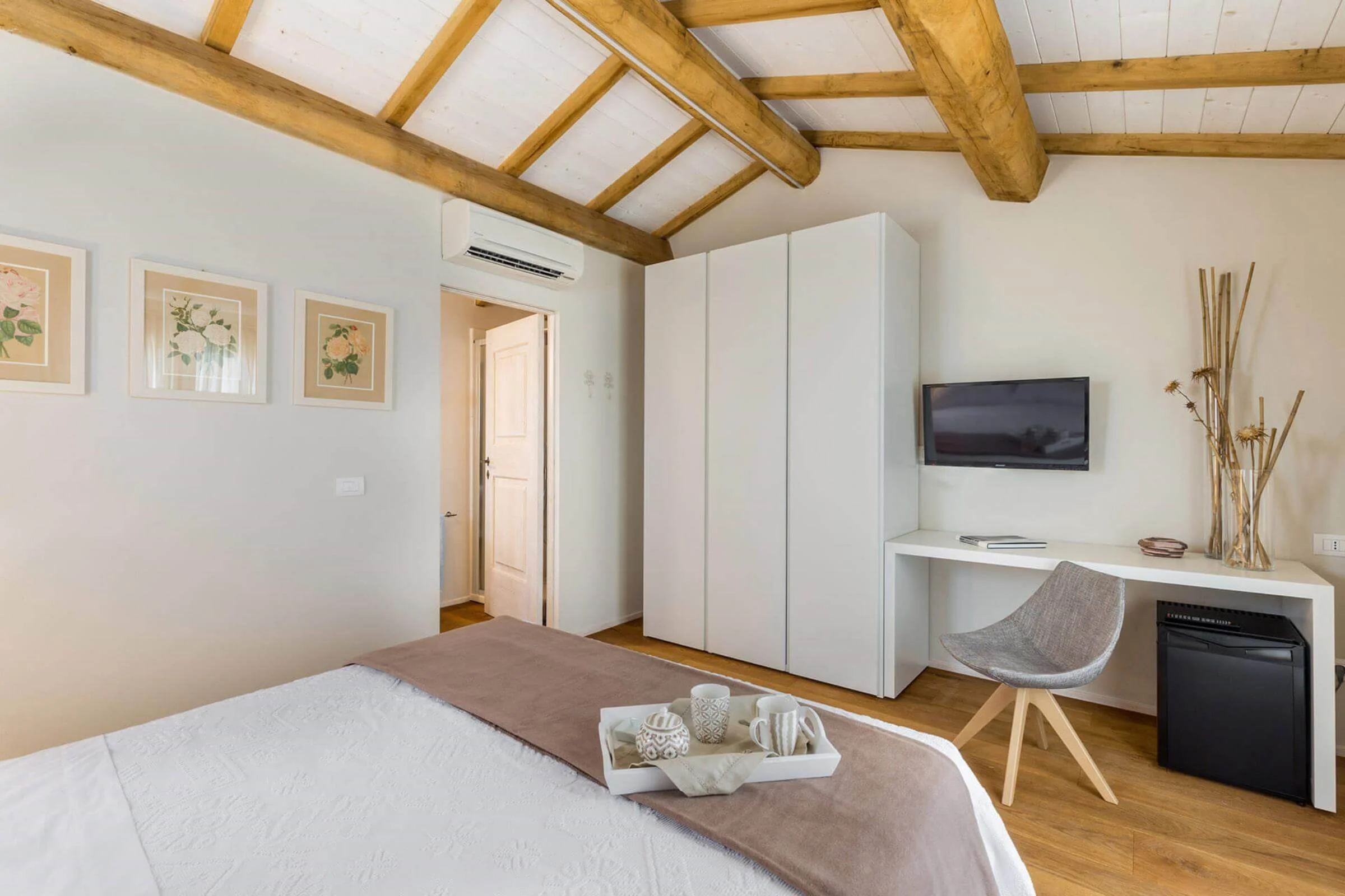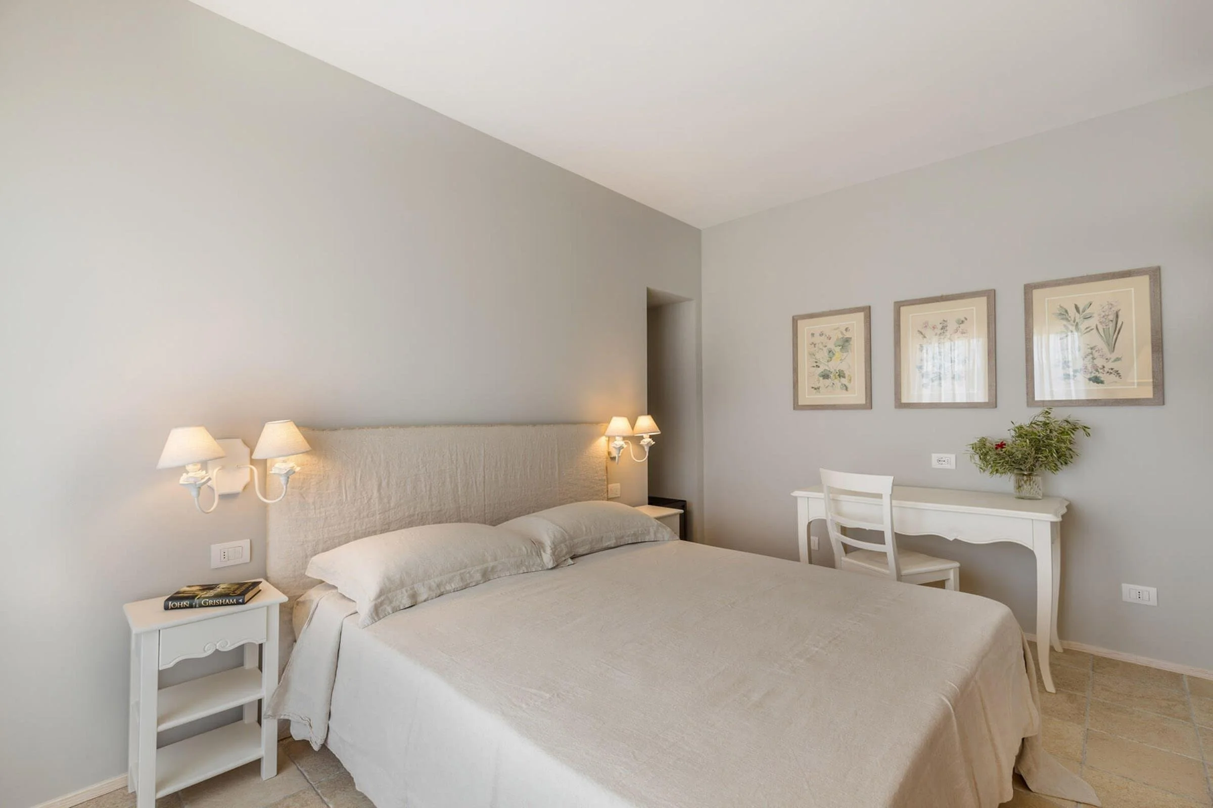 Upstairs and situated in the south part of the building, with a unique view encompassing the Tenuta vineyard and the surroundings. Portion of sun deck with lounger and low table at your disposal. Room is near the olive grove, where you can relax in the hammock. Equipped with one bed, air conditioning, a mini fridge, and desk area.