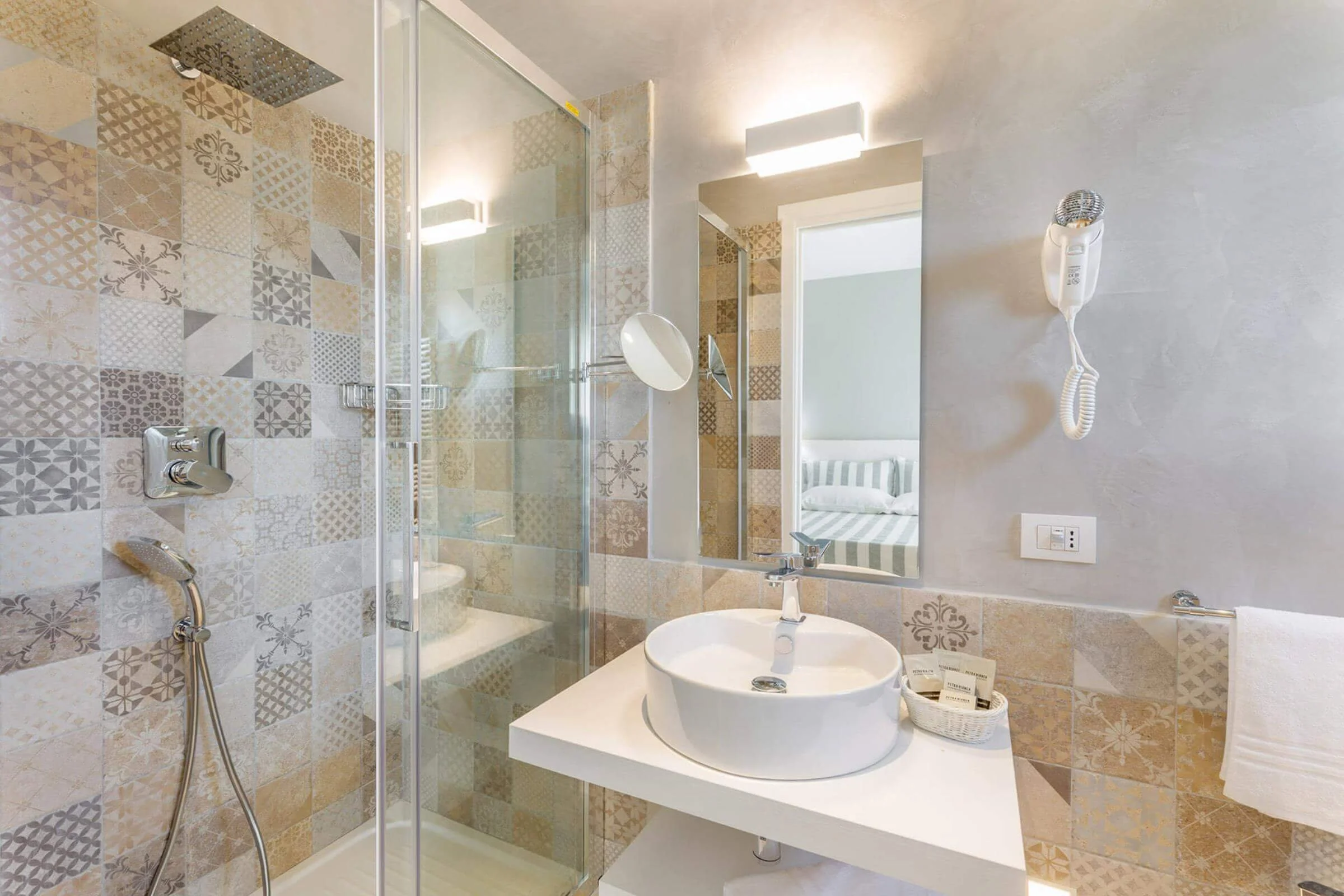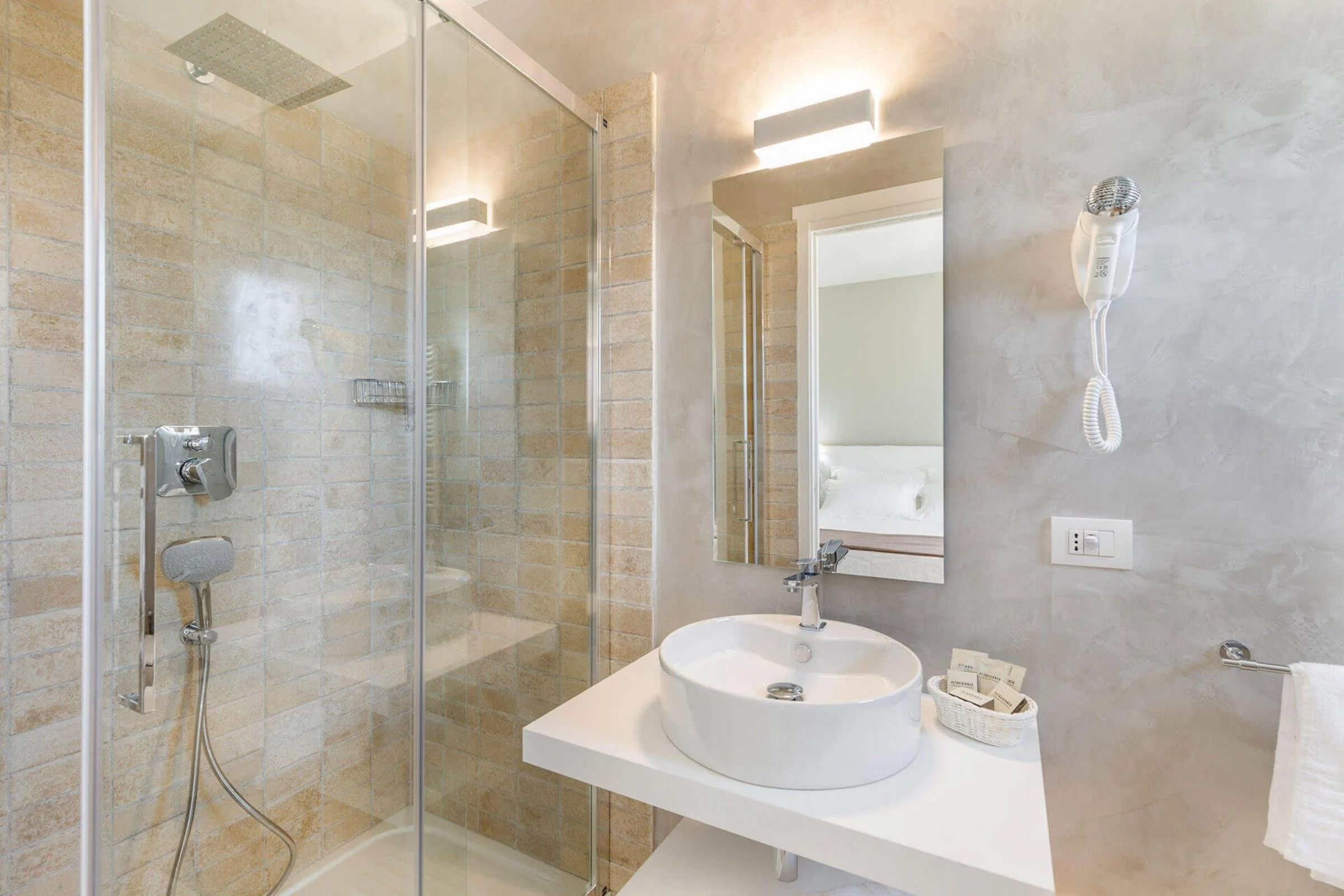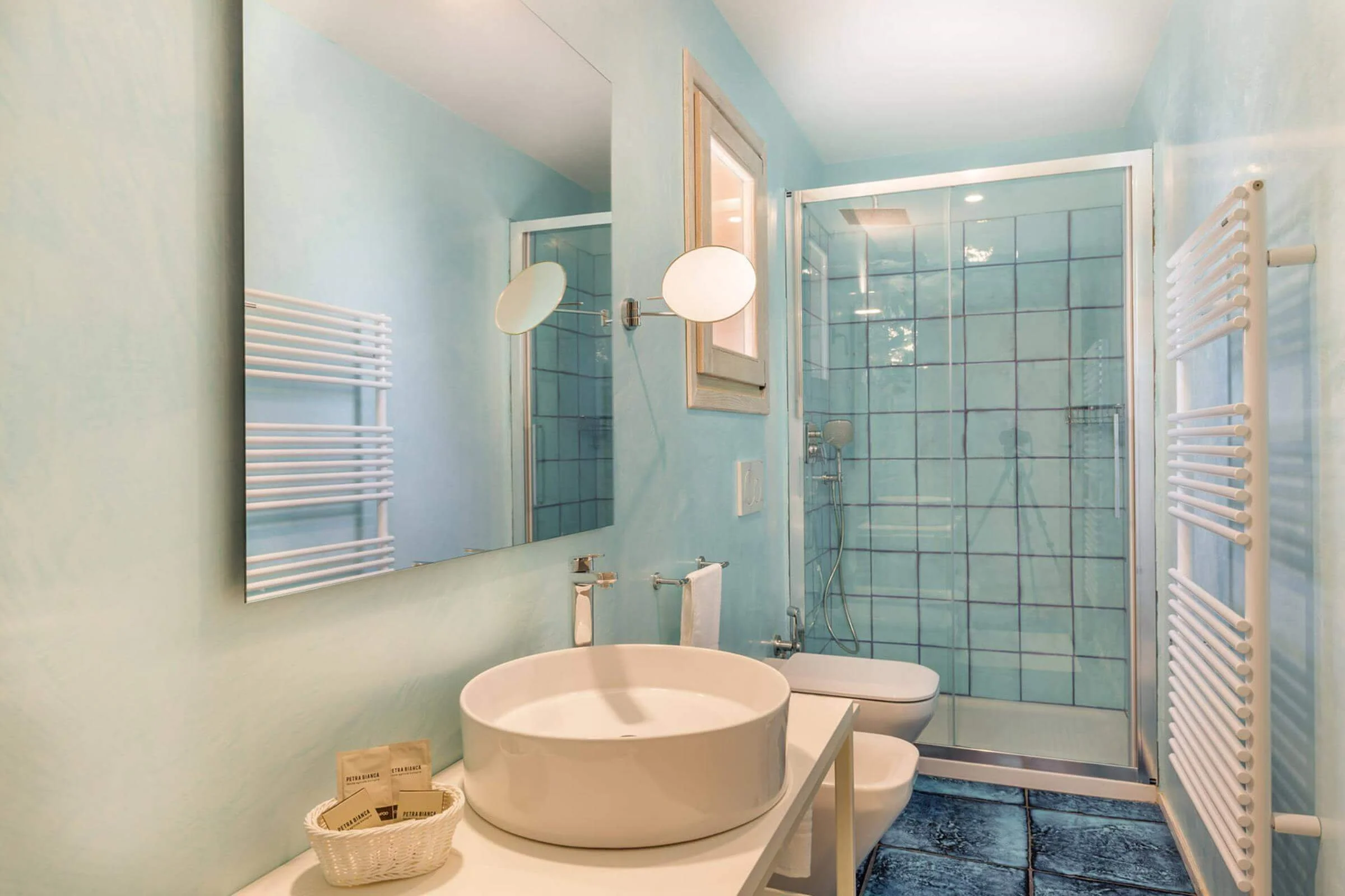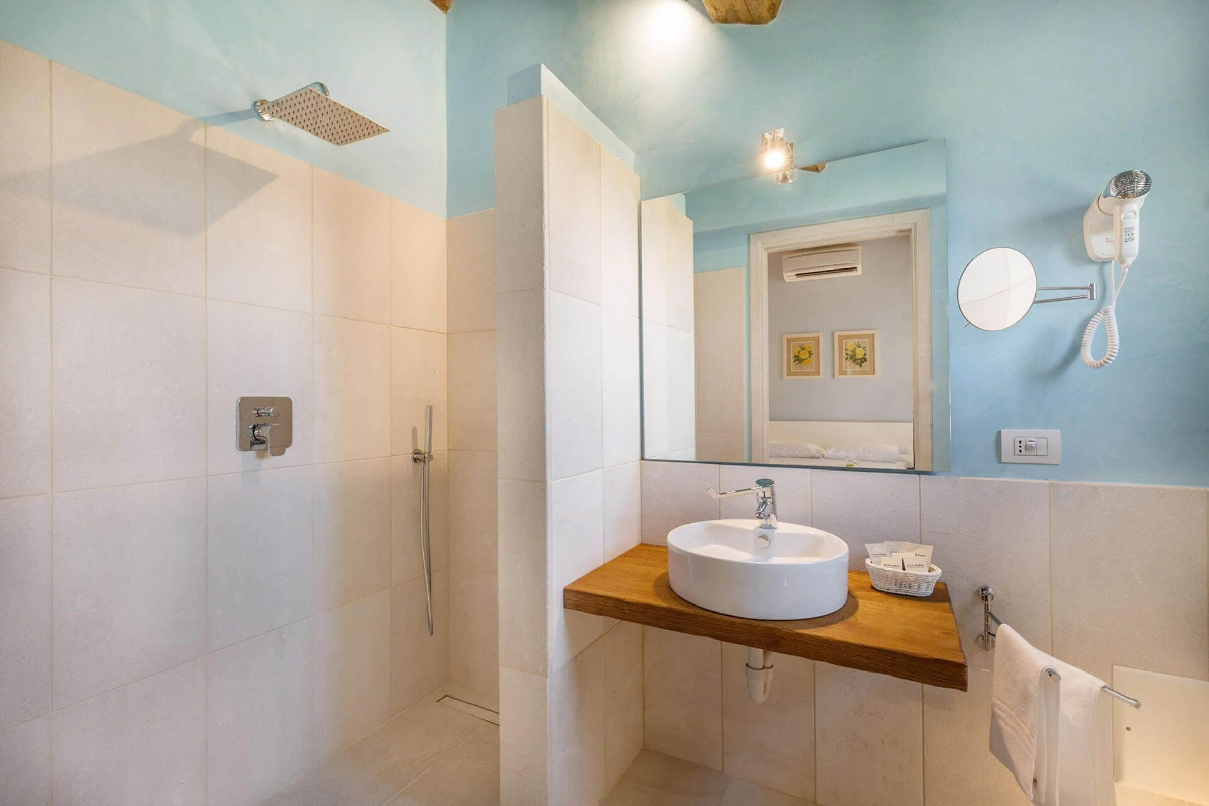 Upstairs and situated in the south part of the building, with a unique view encompassing the Tenuta vineyard and the surroundings. Portion of sun deck with lounger and low table at your disposal. Room is near the olive grove, where you can relax in the hammock. Equipped with one bed, air conditioning, a mini fridge, and desk area.